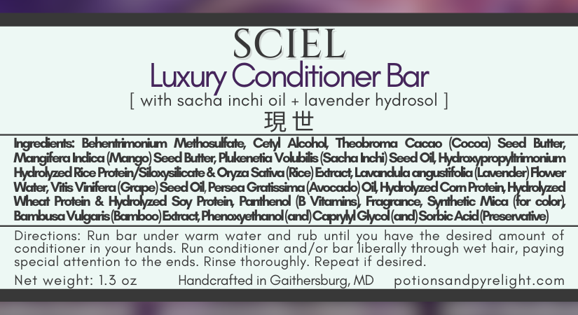 Sciel's hair conditioner bar is especially good for fine to normal hair types. She contains sacha inchi oil, a super lightweight oil that is smoothing, hydrating, yet non-greasy. In addition to containing a rice protein complex that helps in smoothing and preventing split ends, she finishes with lavender hydrosol, a gentle floral water distilled from whole lavender flowers, for a joyful and relaxing experience.
