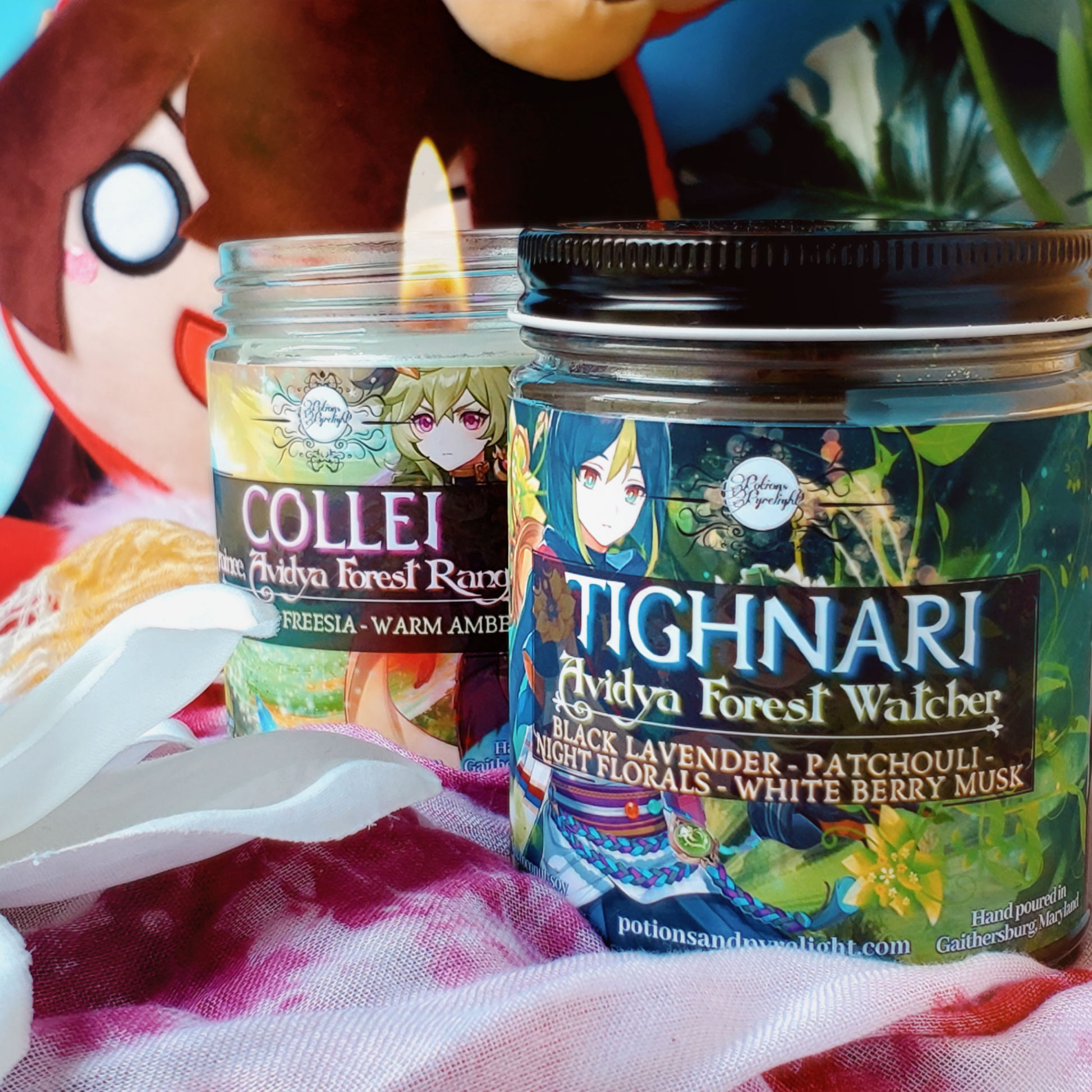Materials: Glass jar, hand poured 100% vegan coconut-soy wax blended with phthalate free custom fragrance oils specific to Potions & Pyrelight, candle dye, ecoglitter, cotton or crackling wooden wick.