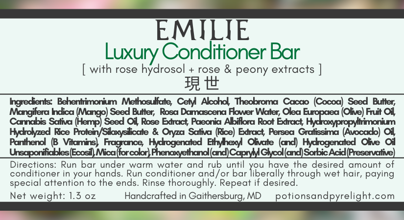 Ingredients : Behentrimonium Methosulfate, Cetyl Alcohol, Theobroma Cacao (Cocoa) Seed Butter, Mangifera Indica (Mango) Seed Butter, Rosa Damascena Flower Water, Olea Europaea (Olive) Fruit Oil, Cannabis Sativa (Hemp) Seed Oil, Rose Extract, Paeonia Albiflora Root Extract, Hydroxypropyltrimonium Hydrolyzed Rice Protein/Siloxysilicate & Oryza Sativa (Rice) Extract, Persea Gratissima (Avocado) Oil, Panthenol (B Vitamins), Fragrance, Hydrogenated Ethylhexyl Olivate (and) Hydrogenated Olive Oil Unsaponifiables (Ecosil), Mica (for color), Phenoxyethanol (and) Caprylyl Glycol (and) Sorbic Acid (Preservative)