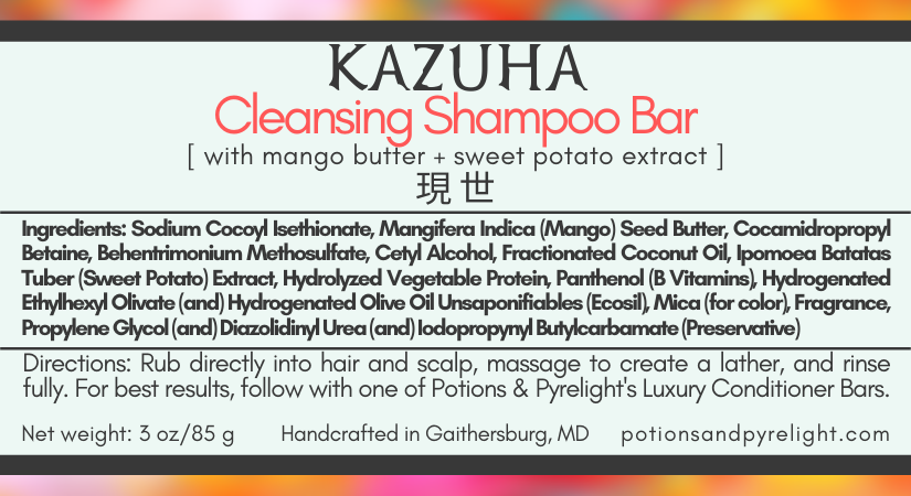 About : Kazuha's bar is made with mango butter and sweet potato extract. Used in hair, Mango Butter seals in moisture and reduces breakage and hair loss by strengthening hair follicles, thereby encouraging the growth of stronger, healthier hair. He also contains sweet potato extract, which packs a powerful punch of beta carotene, which is converted into Vitamin A in our bodies, boosting natural scalp oils and hydration to seal in moisture while promoting healthy hair growth.